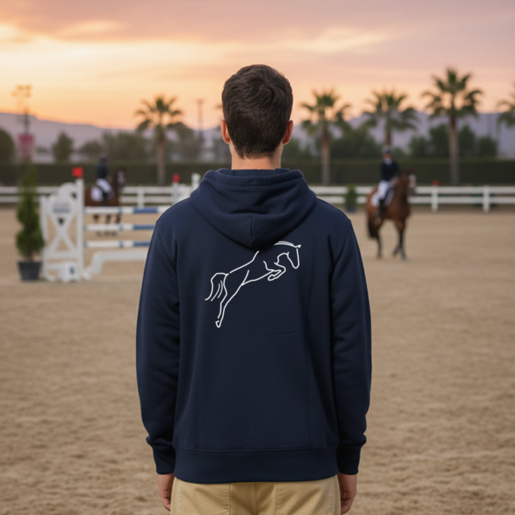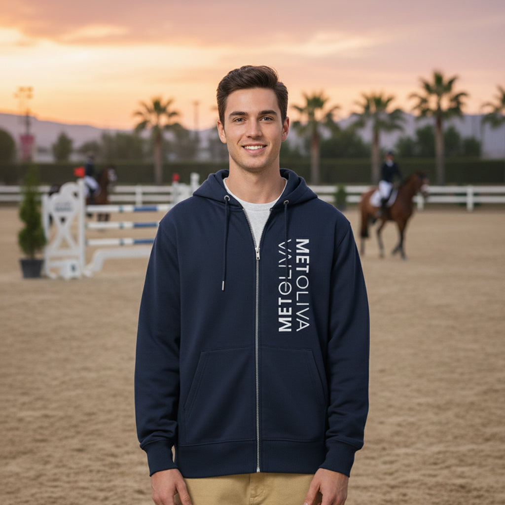Sudadera Met Oliva Zip Hoodie. Un diseño que combina originalidad y tradición en una prenda única. En la parte delantera luce el texto METOLIVA en un formato enfrentado y vertical, moderno y diferente; mientras que en la espalda destaca el emblemático caballo del MET, símbolo reconocido por todos los amantes de la hípica.